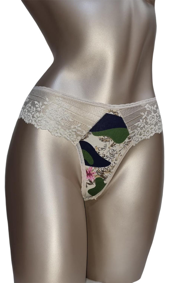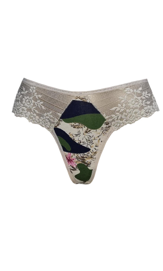 Brasilianska trosor gjorda av spets och bomullMedium midjaVapen färgSpets med blommiga detaljerSpets och bomullsmaterialEuropeiska produkter tillverkade i vår verkstadProdukten motsvarar bilderna som visas