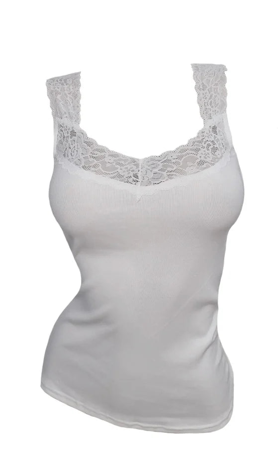Linne för kvinnor av elastisk bomull, tillbehör med spetsBreda remmarFärg vitSammansättning 95% bomull, 5% elastanEu produkter tillverkade i vår verkstadProdukten är enligt bilderna som visas